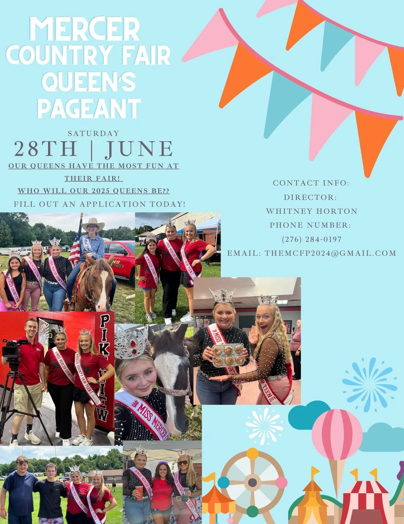 For any questions, please contact Whitney Horton at (276)284-1097 or themcfp@gmail.com. You can also follow the Facebook page specifically for the Mercer County Fair Pageant at the link below for more details and updates.