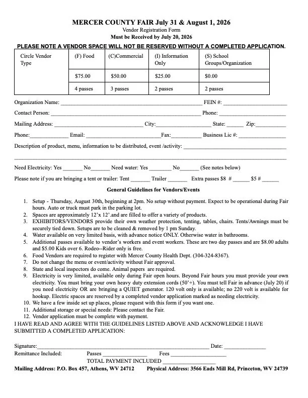 If you plan to serve food at your booth, you will need to complete additional paperwork for the Mercer County Health Department. You can access those resources by clicking here.